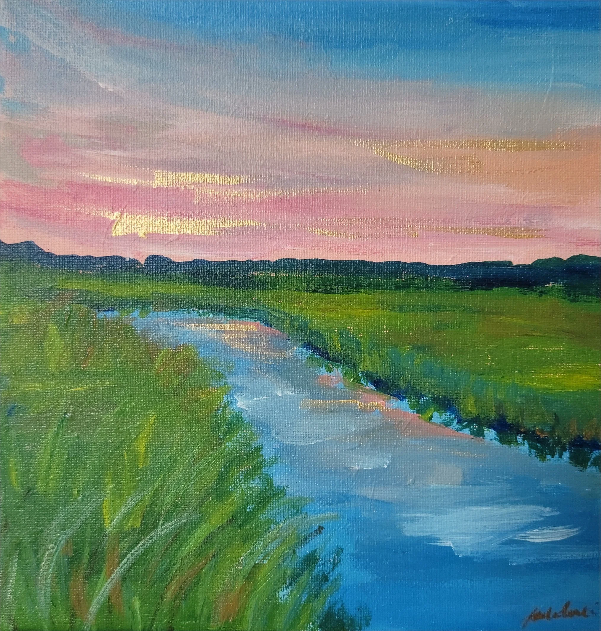 Inspired by the Sunsets in South Carolina’s marshlands, this breezy landscape is full of pinks and blues. Perfect accent piece for your decor.
