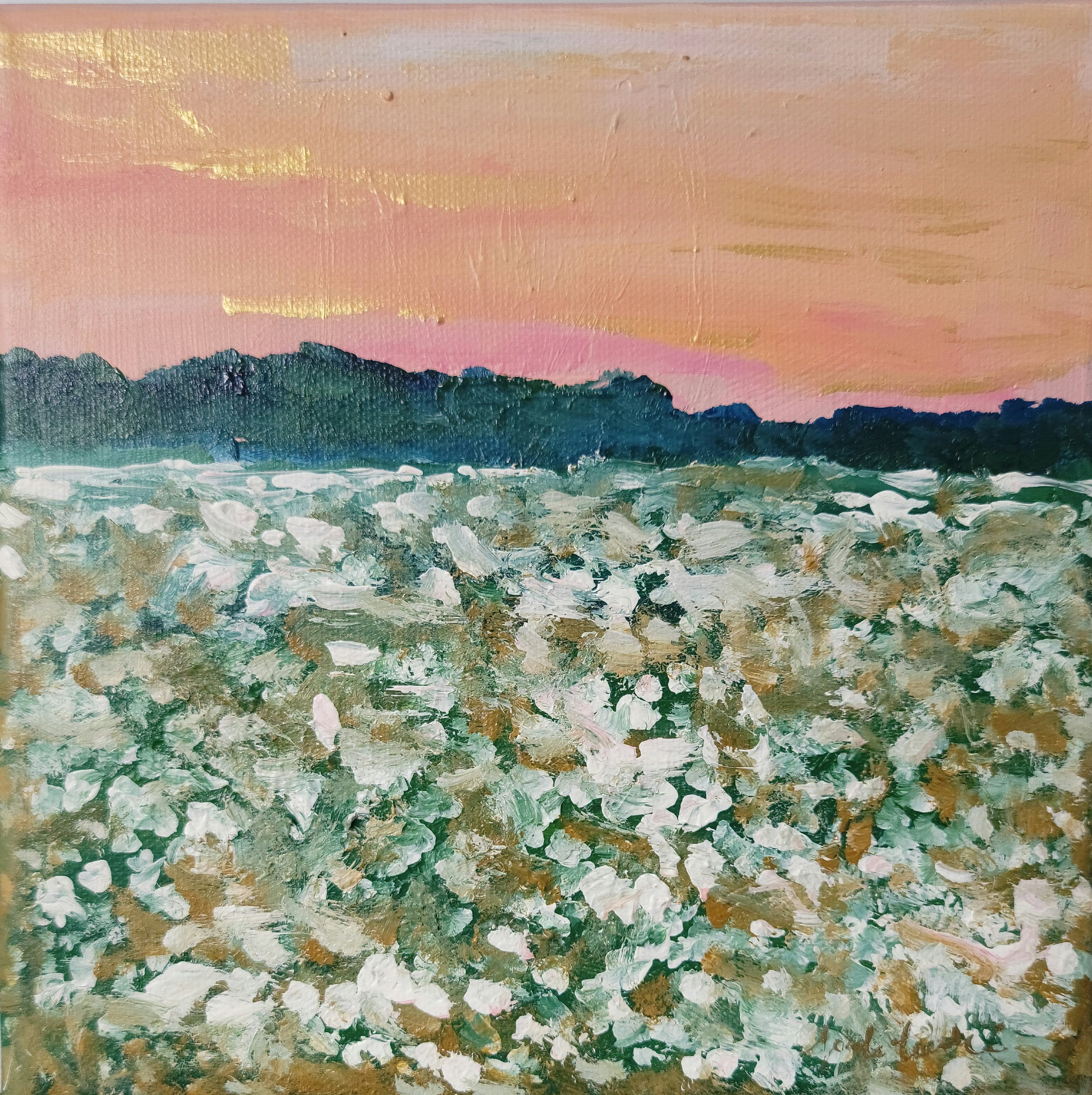 Inspired by the Sunsets overlooking Eufaula AL field of cotton. Full of pinks and golds and capturing the sunset views during Fall in South AL.